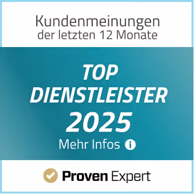Das Sternesiegel zeigt tagesaktuell die durchschnittliche Sternebewertung all unserer Kundenbewertungen und die aktuelle Empfehlungsquote in Prozent. Ergänzt wird es um die Anzahl der veröffentlichten Bewertungen und ein Datum, das den Stand der Kennzahlen markiert. Der „Top Dienstleister 2025“-Award basiert auf den Kundenmeinungen der letzten 12 Monate. Vergeben wird er nur, wenn bestimmte Schwellen erreicht werden.
